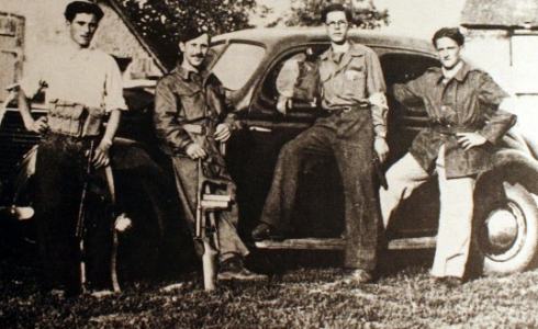 Herbert Brucker OSS hadnagy (balról a második) és csapata 1944-ben, Franciaországban. A csapat két tagjánál UD M42-es géppisztolyok vannak.